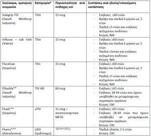 ***Το τριδύναμο εμβόλιο LAIV (Fluenz) περιλαμβάνει ζώντα εξασθενημένο ιό γρίπης και χορηγείται ως νεφέλωμα 0,1ml σε κάθε ρουθούνι. Στα παιδιά μικρότερα των 9 ετών που εμβολιάζονται για πρώτη φορά έναντι της γρίπης, χορηγείται 2η δόση με μεσοδιάστημα τουλάχιστον 4 εβδομάδων.