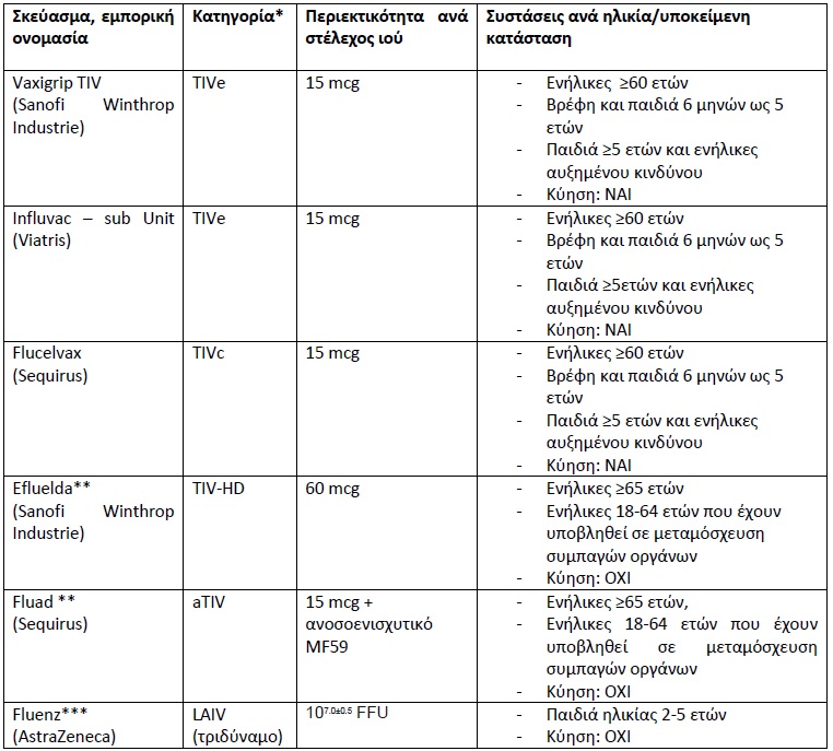 1) Χορηγείται σε όλο το γενικό πληθυσμό με ηλικία:α) άνω των 60 ετών 2) Παιδιά άνω των 5 ετών και ενήλικες (18-59)που παρουσιάζουν έναν ή περισσότερους από τους παρακάτω επιβαρυντικούς παράγοντες ή χρόνια νοσήματα: Χρόνια νοσήματα αναπνευστικού, όπως άσθμα , χρόνια αποφρακτική πνευμονοπάθεια Καρδιακή νόσο με σοβαρή αιμοδυναμική διαταραχή Ανοσοκαταστολή (κληρονομική ή επίκτητη) Μεταμόσχευση οργάνων και μεταμόσχευση μυελού των οστών Δρεπανοκυτταρική αναιμία και άλλες αιμοσφαιρινοπάθειες Σακχαρώδη διαβήτη ή άλλο χρόνιο μεταβολικό νόσημα Χρόνια νεφροπάθεια Χρόνιες παθήσεις ήπατος Νευρολογικά ή νευρομυϊκά νοσήματα Σύνδρομο Down Έγκυες ανεξαρτήτως ηλικίας κύησης, λεχωΐδες και θηλάζουσες Άτομα με νοσογόνο παχυσαρκία (Δείκτη Μάζας Σώματος >40Kg/m2) και παιδιά με ΔΜΣ >95η ΕΘ Παιδιά που παίρνουν ασπιρίνη μακροχρόνια (π.χ. νόσος Kawasaki, ρευματοειδή αρθρίτιδα και άλλα) για τον πιθανό κίνδυνο εμφάνισης συνδρόμου Reye μετά από γρίπη. Άτομα που βρίσκονται σε στενή επαφή με παιδιά μικρότερα των 6 μηνών ή φροντίζουν ή διαβιούν με άτομα με υποκείμενο νόσημα, που αυξάνει τον κίνδυνο επιπλοκών της γρίπης. Κλειστοί πληθυσμοί, όπως προσωπικό και εσωτερικοί σπουδαστές (σχολείων, στρατιωτικών και αστυνομικών σχολών, ειδικών σχολείων κ.λπ.), νεοσύλλεκτοι, ιδρύματα χρονίως πασχόντων και μονάδες φιλοξενίας ηλικιωμένων, καταστήματα κράτησης κ.α. Εργαζόμενοι σε χώρους παροχής υπηρεσιών υγείας (ιατρονοσηλευτικό προσωπικό, λοιποί εργαζόμενοι, φοιτητές επαγγελμάτων υγείας σε κλινική άσκηση) και σε κέντρα διαμονής προσφύγων – μεταναστών. Άστεγοι Κτηνίατροι, πτηνοτρόφοι, χοιροτρόφοι, εκτροφείς [συμπεριλαμβανομένων εκτροφέων μίνκ (γουνοφόρα θηλαστικά)], εργαζόμενοι σε σφαγεία και γενικά άτομα που έρχονται σε συστηματική επαφή με πτηνά ή χοίρους. |