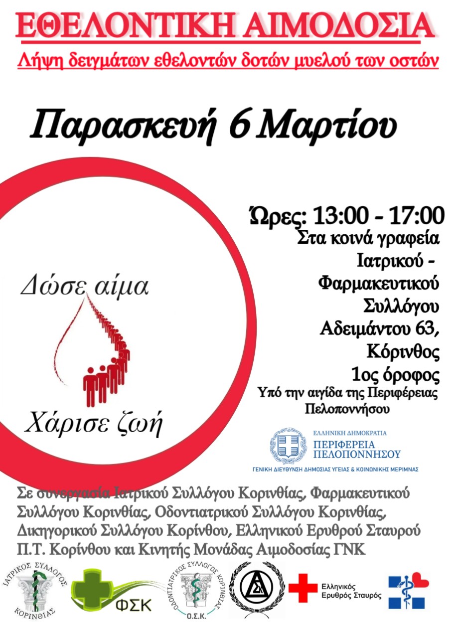 με τη συμμετοχή του Ιατρικού, του Φαρμακευτικού, του Οδοντιατρικού Συλλόγου Κορινθίας, του Δικηγορικού Συλλόγου Κορίνθου και την αρωγή του Ελληνικού Ερυθρού Σταυρού ΠΤ Κορίνθου και της Κινητής Μονάδας Αιμοδοσίας του ΓΝΚ, υπό την αιγίδα της Περιφέρειας Πελοποννήσου.